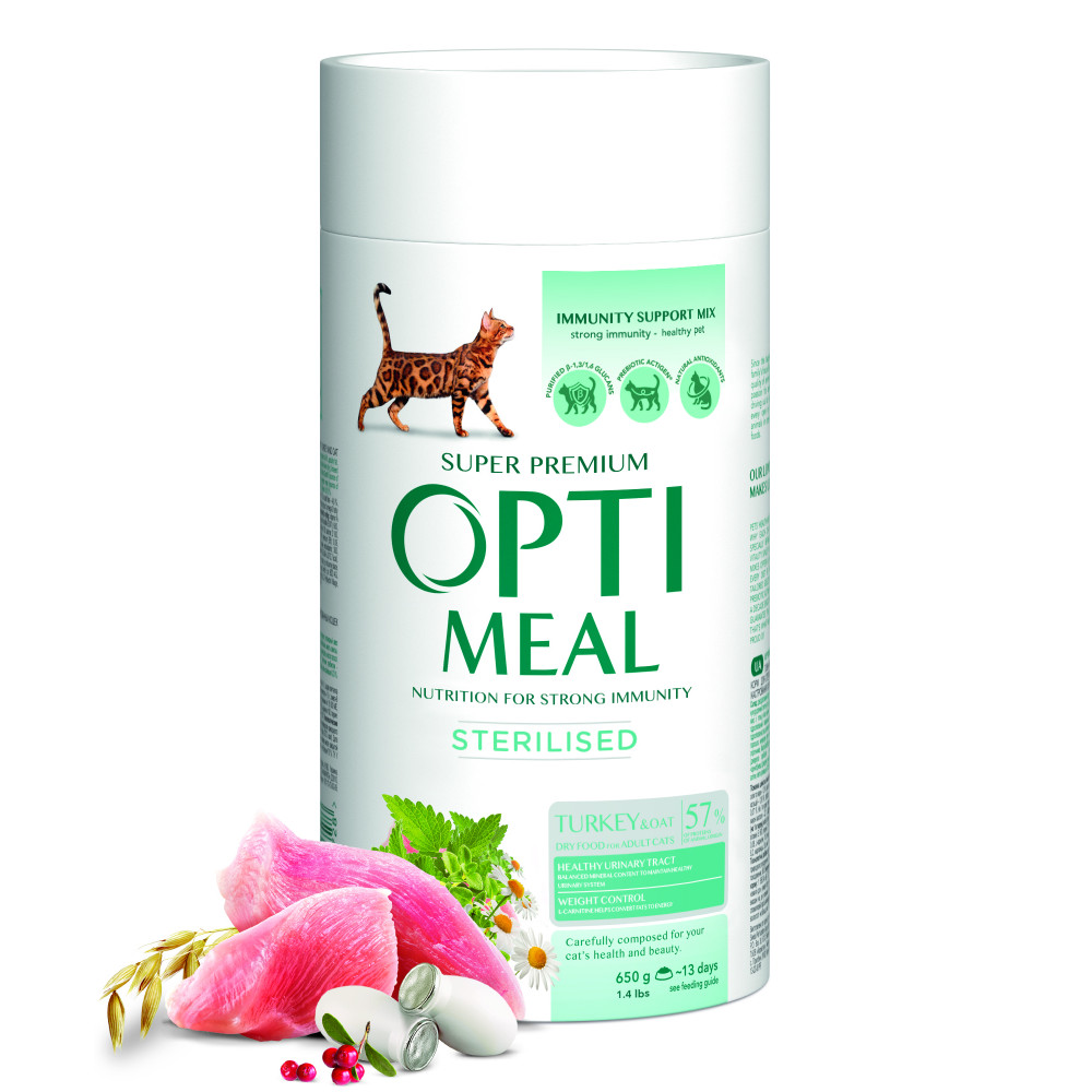 Сухий корм OPTIMEAL для дорослих кастрованих котів та стерилізованих кішок ІНДИЧКА та ОВЕС 0,65 кг